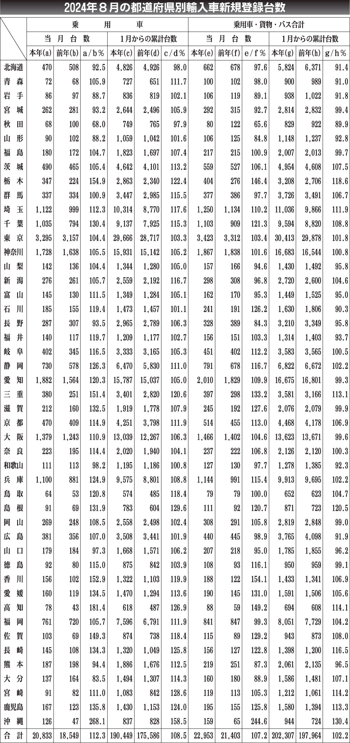 〈2024年8月の都道府県別輸入車新規登録台数〉