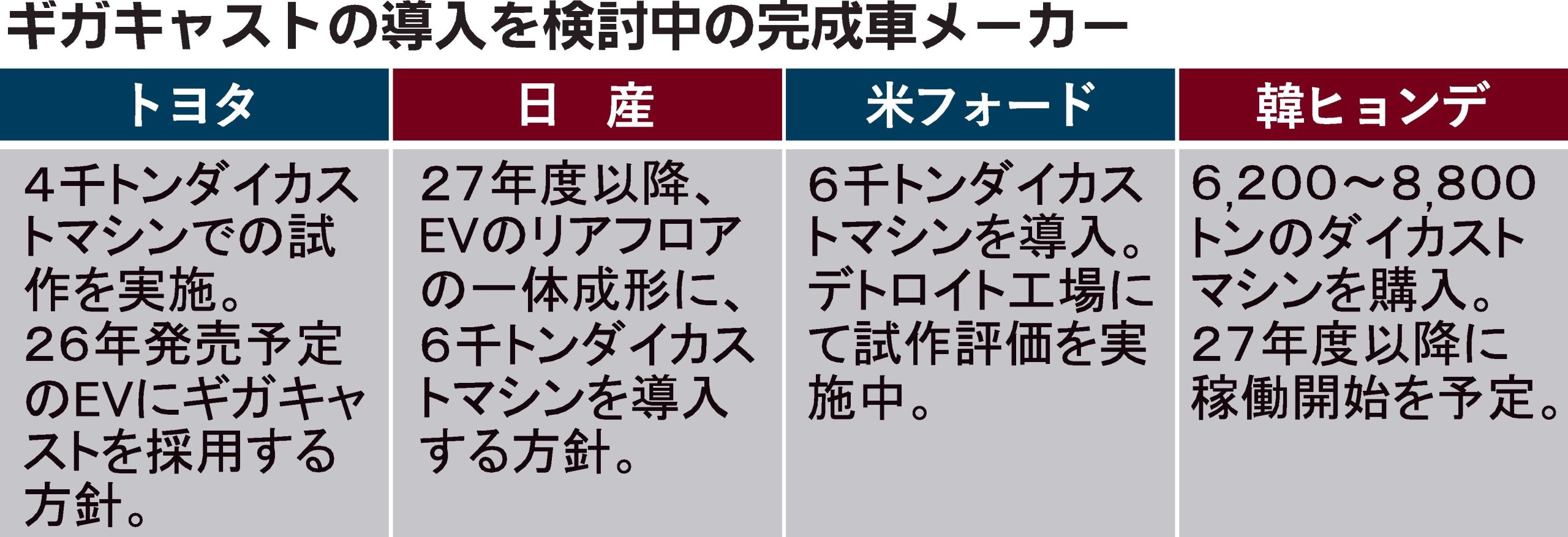 電気自動車(EV)の製造手法としてアルミ大型一体鋳造技術「ギガキャスト」が注目されている。コストや汎用性、補修性など課題も多いが、何枚もの鋼板をプレスし、溶接して車体を造る長年の製造手法に新風を吹き込んでいることは確かだ。骨格部品の主流だ...
