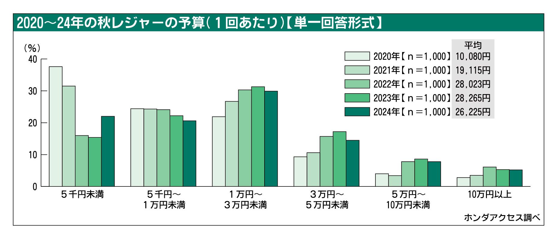 ホンダアクセス(酒井富志也社長、埼玉県新座市)がまとめた2024年版の「秋レジャーと車中泊に関する調査」によると、今秋のレジャーに使用する予算の平均額は1回当たり2万6225円だった。2万円以上となったのは3年連続。ただ、前年からは約2千...