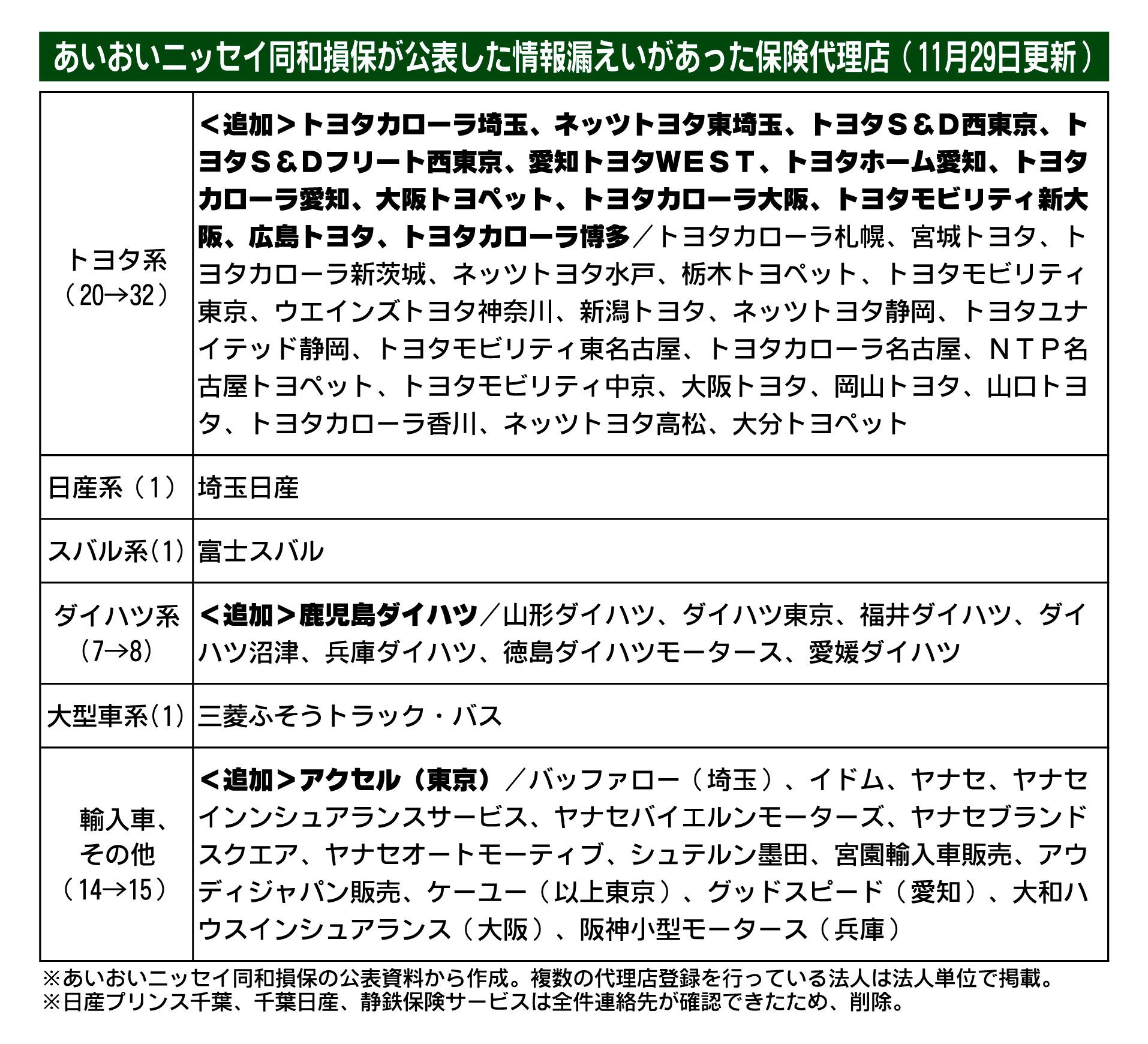 損害保険大手4社による一連の情報漏えい問題で、あいおいニッセイ同和損害保険は11月29日、漏えいが判明した自動車ディーラーを含む保険代理店のうち、連絡先の分からない顧客がいる代理店が新たに14社確認されたと発表した。9月27日に初めて公表し、今回が2回目の更新で、計58社となった。