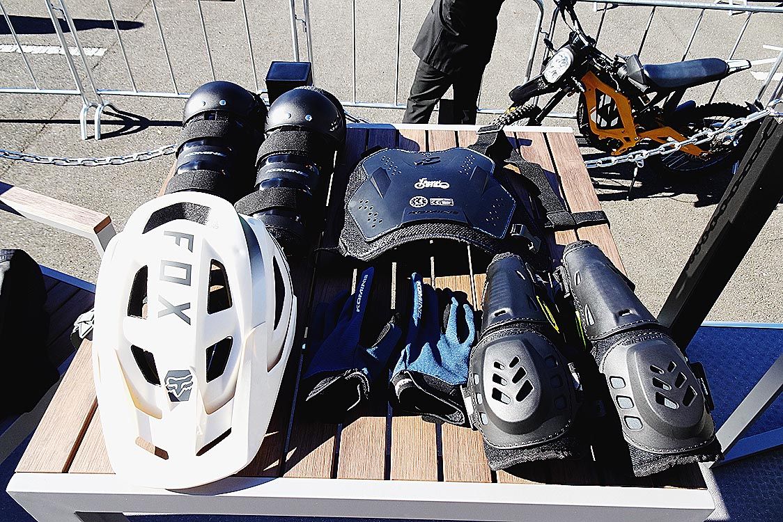 ヘルメットやプロテクターを装着し、試乗コースに出た。同施設には約20種類の電動モビリティを用意するが、今回試乗に選んだのは、新興企業のグラフィット(鳴海禎造社長、和歌山市)の電動バイク。車両やタイヤのサイズは、クルマにも詰め込める折り畳み自転車と同程度だ。最大の違いはペダルが固定されていること。加速はハンドルバー右側のスロットルで行う。ペダルは漕ぐためのものではなく足置き場だ。