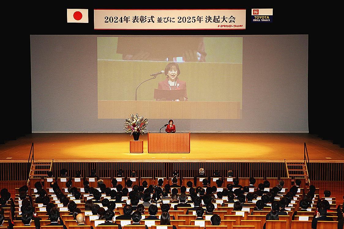 【山形】トヨタカローラ山形(鈴木肇子社長)は、山形市で「2025年決起大会」を開催した。役員と社員合わせて440人が出席し、25年度の経営方針と各店舗の目標を確認した。また、24年度に優秀な成績を収めた社員と店舗を表彰した。 あいさつで鈴...