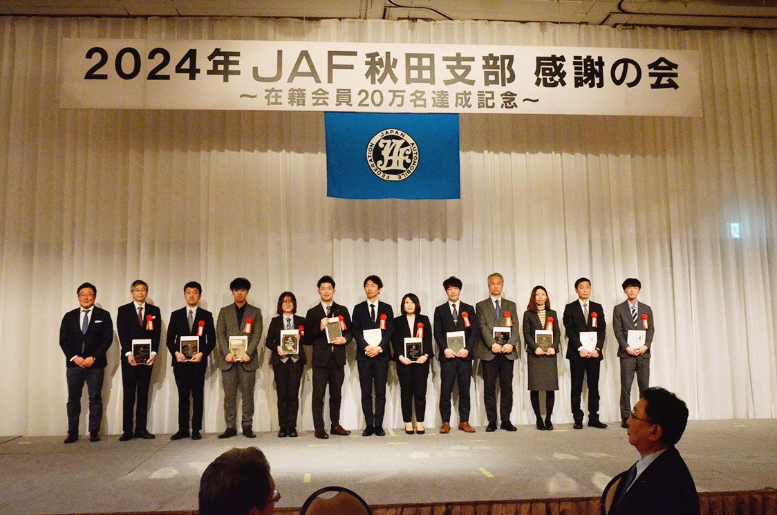 【秋田】日本自動車連盟(JAF)秋田支部(伊藤哲充支部長)は、秋田市で「感謝の会」を開催した。新規入会やクレジット登録などの項目で秀でた成績を収めた販売会社と店舗、社員を表彰した。 伊藤支部長は2024年の振り返りとして、在籍会員数が20...