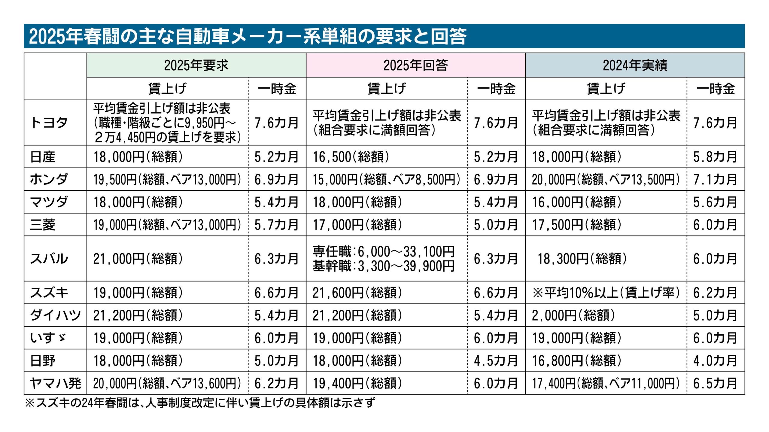 〈2025年春闘の主な自動車メーカー系単組の要求と回答〉