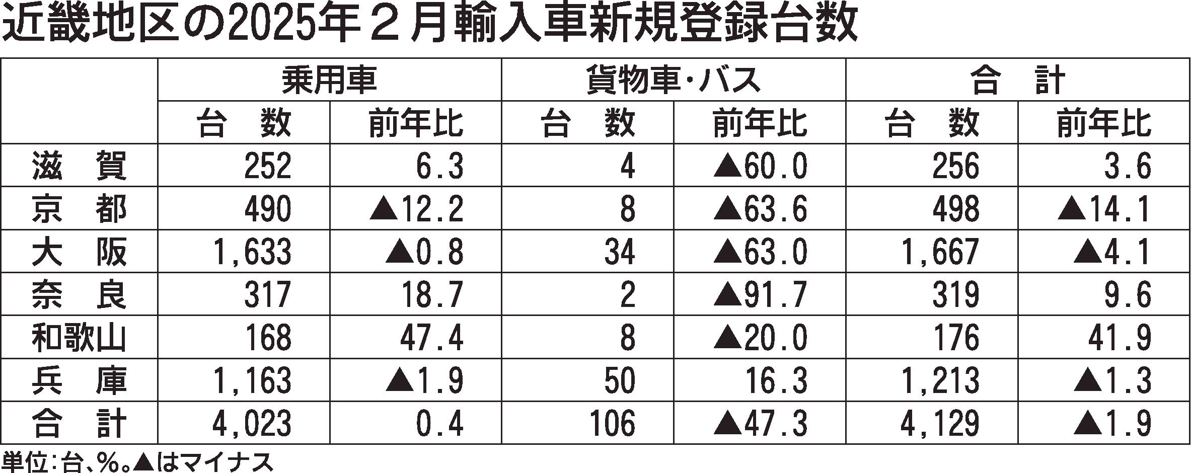日本自動車輸入組合(JAIA)の発表によると、2月の近畿地区の輸入車新規登録台数(外国メーカー車と日本メーカー車)は前年同月比1.9%減の4129台で、2カ月ぶりにマイナスとなった。 乗用車は同0.4%増の4023台で、2カ月連続のプラス...