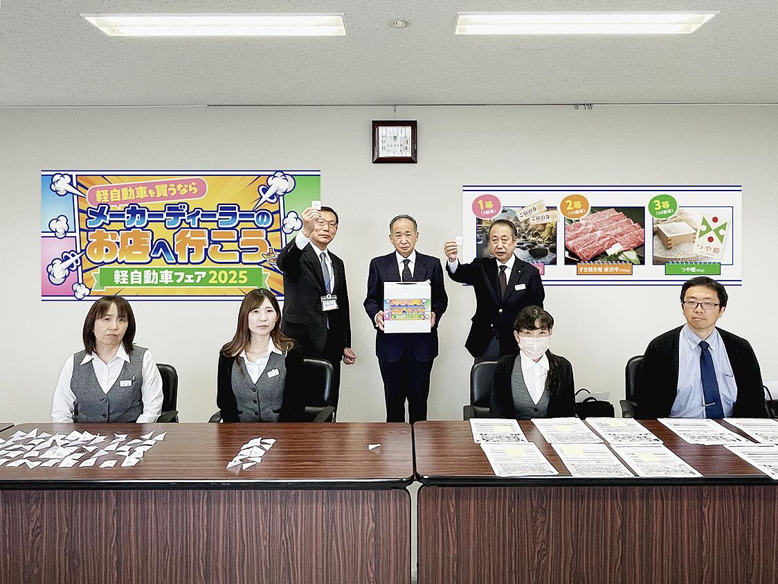 【山形】山形県軽自動車協会(鈴木武浩会長)は、2月6~16日に開催した「軽自動車フェア2025」のプレゼント抽選会を山形市で実施した。鈴木会長らが出席して厳正に抽選を行い、1等ペア宿泊券3組、2等すき焼き用米沢牛700㌘10組、3等山形県...