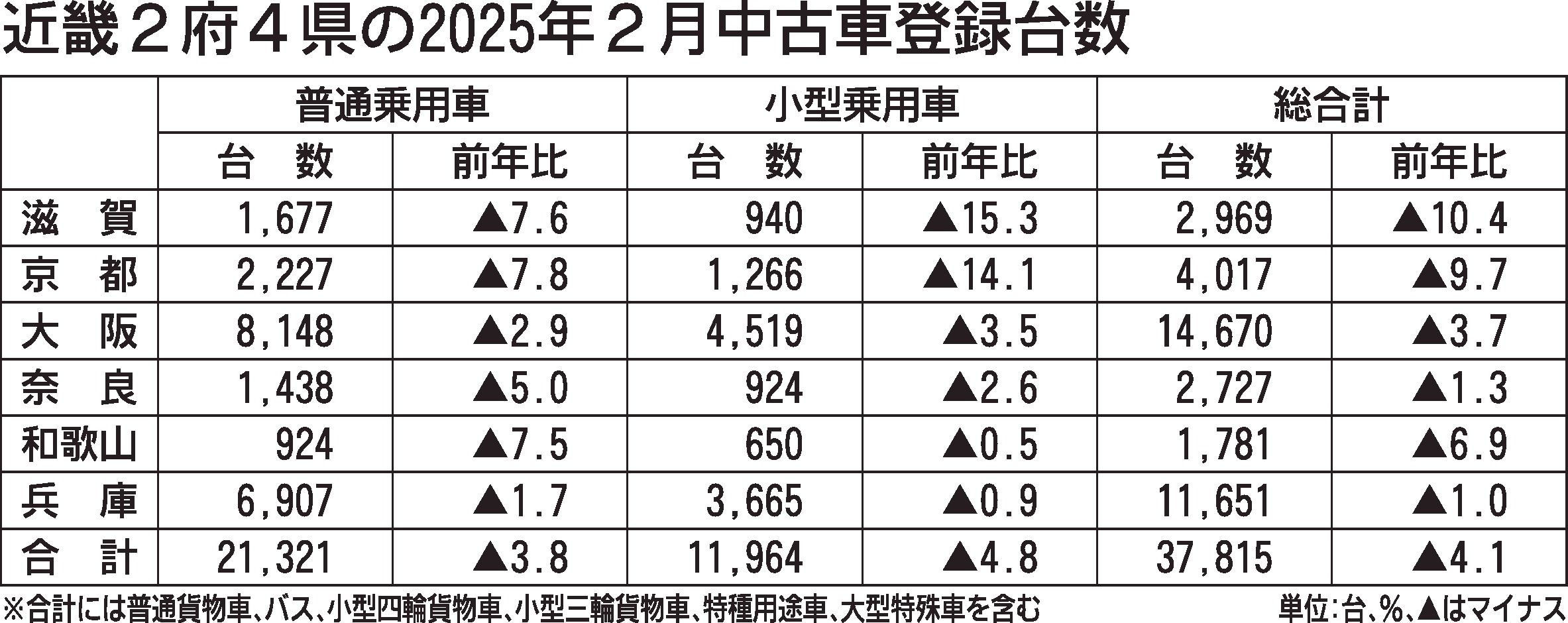 近畿2府4県の2月の中古車登録実績(軽自動車を除く)がまとまった。新規・移転・変更手続きを合算した登録台数は前年同月比4.1%減の3万7815台だった。特種用途車と大型特殊車を除くすべての分類で前年割れとなるなど市場の低迷が続く。 乗用車...