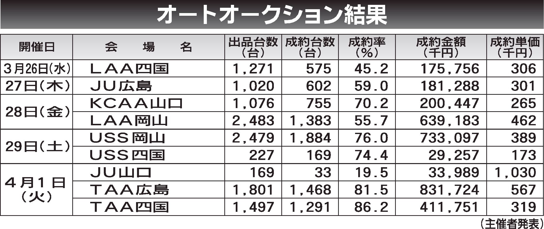 〈オートオークション結果〉中四国地区 2025/3/26~4/1