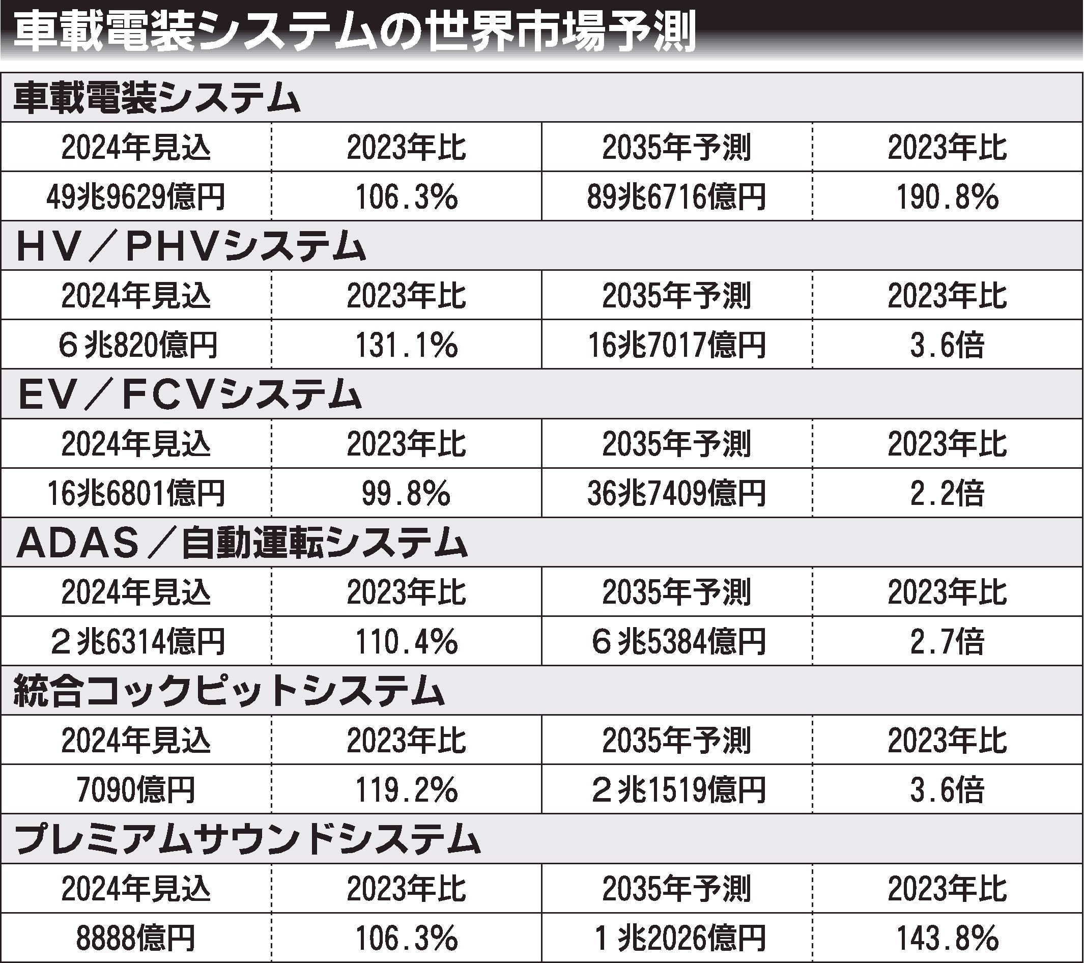 富士キメラ総研(田中一志社長、東京都中央区)は、2035年の車載電装システムの世界市場予測をまとめた。内燃機関の減少でパワートレイン系システムが縮小する一方、電気自動車(EV)を含む電動車関連の電装システムや、先進運転支援システム(ADA...