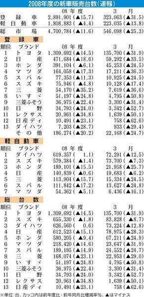 日本自動車販売協会連合会(自販連、天野洋一会長)が1日発表した2008年度の登録車販売は前年度比15・7%減の289万1901台。6年連続で減少するとともに1971年以来37年ぶりの300万台割れになった。車種別では、普通乗用車が景気悪化...