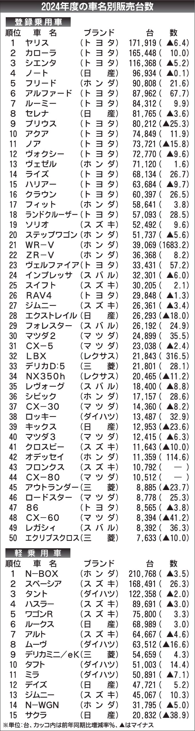 2024年度の車名別販売、N-BOXが4年連続首位 2位ヤリス 3位スペーシア 3月もN-BOXが3カ月連続