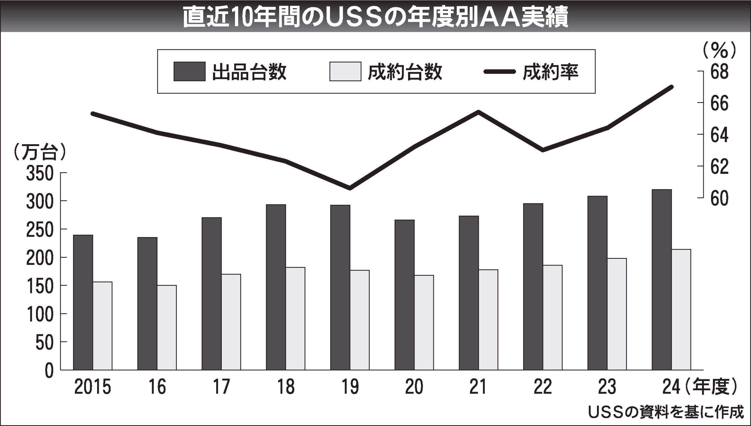 ユー・エス・エス(USS)が7日発表した2024年度の中古車オークション(AA)の実績によると、成約率が前年比2.6㌽増の67.0%となり、11年ぶりに過去最高を更新した。出品台数が同3.8%増の320万2002台と3年連続で過去最高だっ...