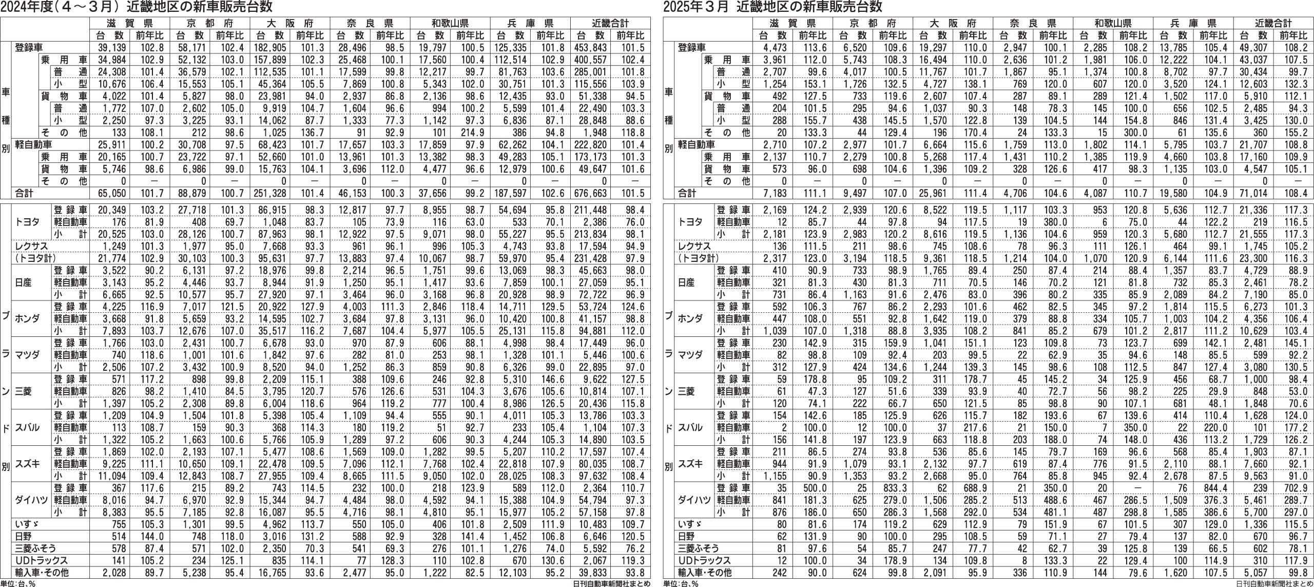 近畿2府4県の2024年度の新車販売台数(軽自動車を含む)は前年度比1.5%増の67万6663台で、3年連続の前年超えとなった。上期は落ち込んだが、1月以降のプラスでカバーした。登録車は同1.5%増の45万3843台、軽は同1.4%増の2...