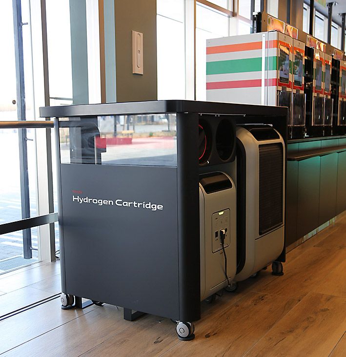 セブン-イレブンジャパンは、水素で発電した電力で店舗内に設置したスムージーマシンを未来型店舗で稼働させる。持ち運び可能な水素カードリッジを使用し、同社の配送トラックで、会場内で営業する「西ゲート店」まで配送する計画。この実証はトヨタと共同で行う予定。