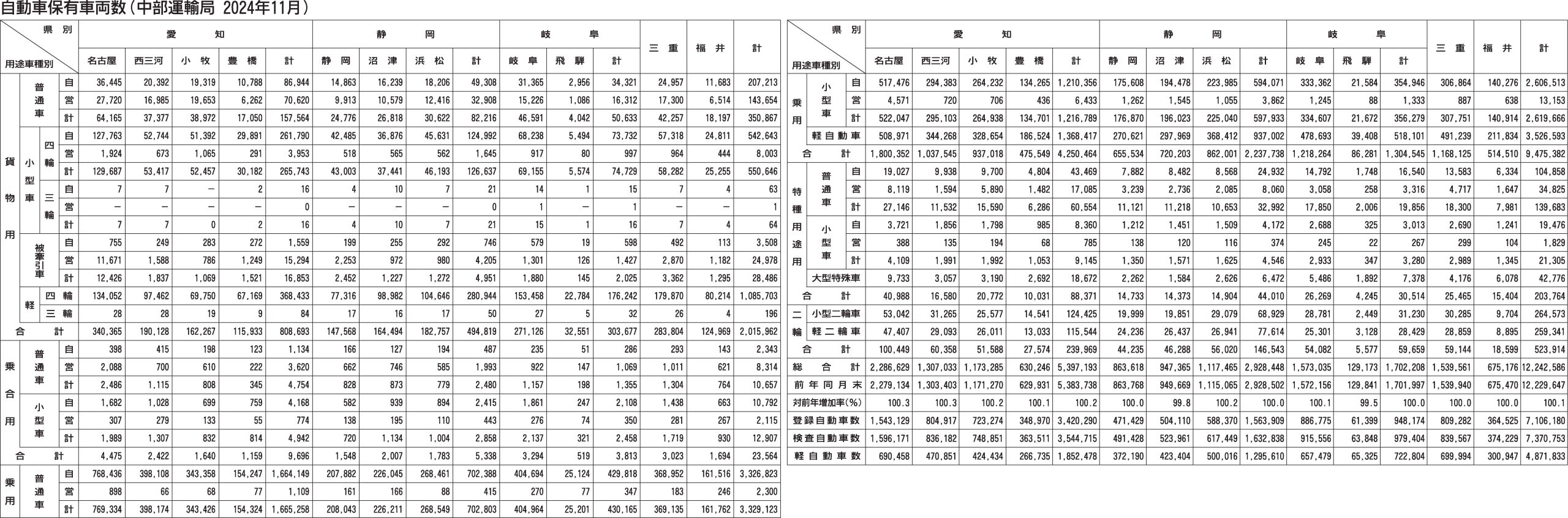 〈自動車保有車両数(中部運輸局 2024年11月)〉