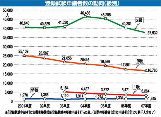 日本自動車整備振興会連合会(日整連、坪内恊致会長)が実施している自動車整備技能登録試験の2007年度総受験者数が5万6820人となり、1971年の認定試験制度発足以来、初めて6万人を下回った。18歳人口の減少、若年層の車離れ、自動車整備士...