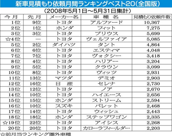 オートックワンが集計した5月の新車見積もり依頼ランキングは、5月12日に発表されたトヨタ・アルファード/ヴェルファイアが1位と4位に入り、4月まで6カ月連続でトップを続けていたホンダ・フィットを2位に後退させた。同じく5カ月連続2位のダイ...