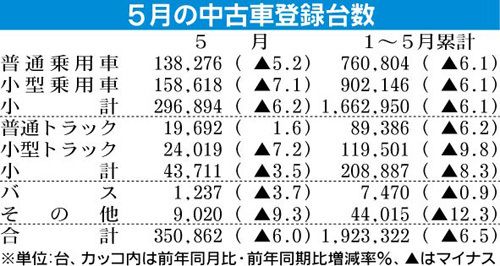 日本自動車販売協会連合会(自販連、天野洋一会長)が11日発表した5月の中古車登録台数は、前年同月比6.0%減の35万862台で、2006年4月以来26カ月連続で減少した。自販連では「新車需要の低迷に伴う下取り車の入庫減少が影響し、中古車の...