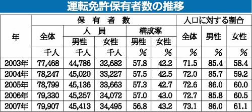 2007年12月末時点の運転免許保有者数は、前年に比べ0.7%(57万人)増加して約7991万人となった。このうち男性は4541万人(前年比0.4%増)、女性は3449万人(同1.2%増)と伸び率では女性が男性を上回った。年齢層別の増加数...