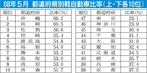 2008年5月の新車販売において、軽自動車比率が40%を上回った県は33県で、前年同月と同数となった。全国平均は38.6%と前年同月比0.8ポイント上昇している。都道府県別では群馬が41.4%となり、98年10月の軽自動車規格拡大以降で初...