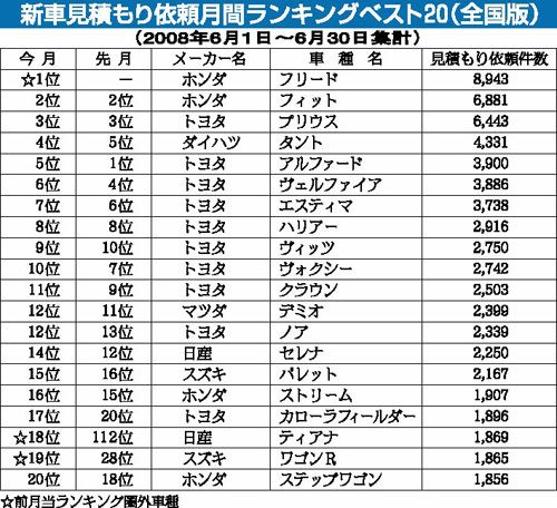 オートックワンが集計した6月の新車見積もり依頼ランキングは、5月29日に発表されたホンダ・フリードが1位に入った。2位にはホンダ・フィットが入り、ホンダが1位と2位を独占した。前月に1位と4位に入ったトヨタ・アルファード/ヴェルファイアは...