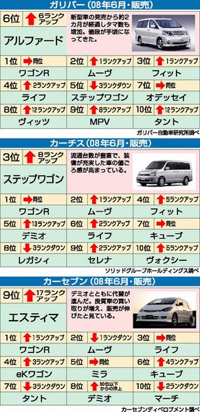 ガリバー自動車研究所、ソリッドグループホールディングス(カーチス)、カーセブンデベロプメントが調べた2008年6月の中古車販売ランキングでは、ガソリン価格の高騰にともなう消費者需要の小型車と低燃費車シフトが鮮明になっている。食料品などの相...