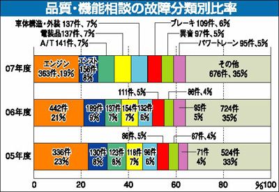 民間の自動車ADR(裁判外紛争解決)機関である自動車製造物責任相談センターに寄せられる苦情相談のうち、63.8%の構成比を有するのが「品質・機能」についての相談だ。2007年度の品質・機能相談件数は「エンジン(エンストを除く)」や「エンス...