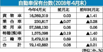 2008年4月末時点の国内自動車保有台数が、過去最大の減少となったことが明らかになった。同時点での保有台数は7914万2882台で、前月に対しては0.08%の増加となったものの、前年同月に対しては0.21%減で、台数ベースでは16万972...