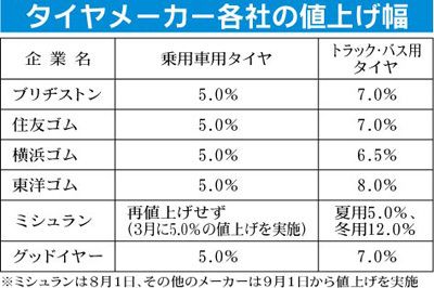 タイヤメーカー各社が8月、9月にかけて国内市販向けタイヤの値上げを相次いで実施することを決めた。天然ゴムに加え、原油高の記録的な高騰に伴い合成ゴムなどの石油系材料の価格上昇が、これまでを上回る勢いで推移しているためだ。特に国内メーカー4社...