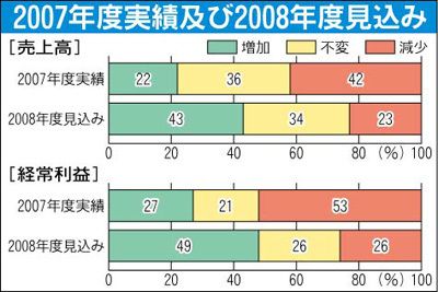 日本自動車機械器具工業会(自機工、北川不二男理事長)はこのほど、会員企業55社に対し実施した2008年度企業動向調査の結果を発表した。経営状況は昨年度実績に比べ売上高および経常利益が増加した企業は約3割にとどまり、減少または横ばいとする企...