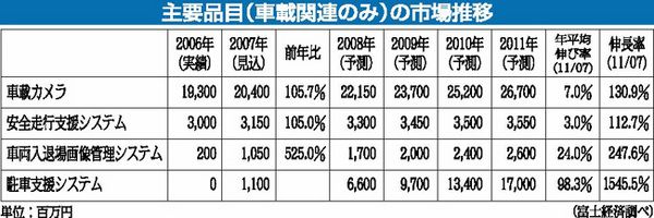 マーケティング会社の富士経済(阿部界社長、東京都中央区)は自動車分野や産業での活用が本格化している画像処理システムの国内市場動向を「2008画像処理システム市場の現状と将来展望」としてまとめ発表した。主要7分野・40品目を合計した総市場は...