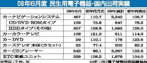 電子情報技術産業協会(JEITA)が発表した2008年6月度民生用電子機器・国内出荷実績は、前年同月比9.8%増の2641億円で13カ月連続のプラスとなった。カーAVC機器も同6.6%増の757億円で11カ月連続のプラスとした。 カーナビ...