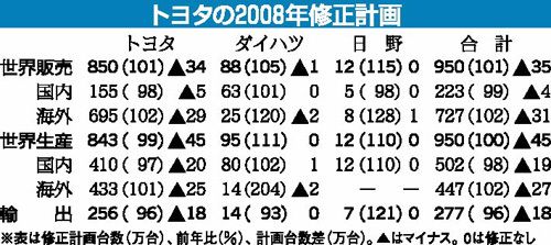 トヨタ自動車は28日、2008年計画の下方修正を発表した。ダイハツ工業、日野自動車を含めたグローバル販売は当初計画の985万台(前年比5%増)から950万台(同1%増)へ35万台引き下げた。トヨタのグローバル販売は当初計画より34万台少な...