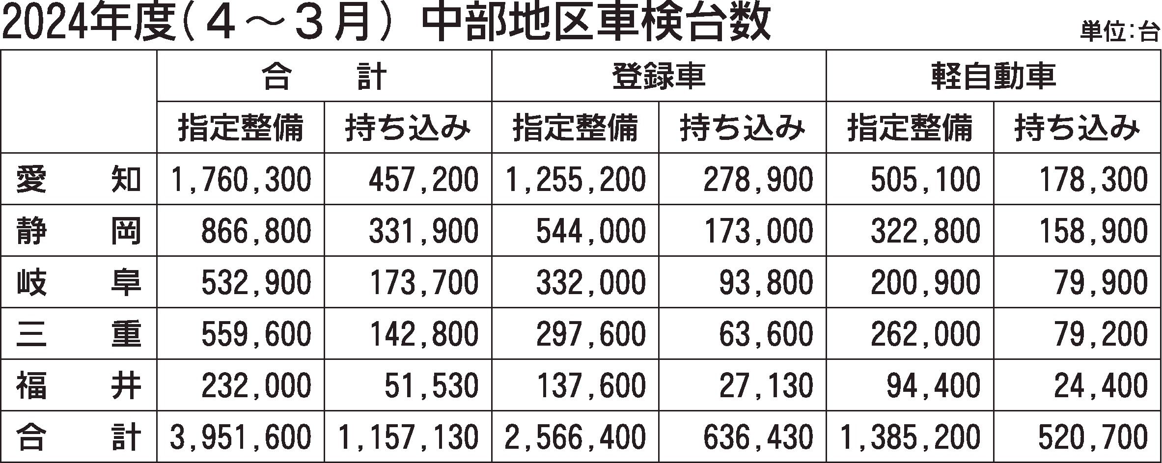 中部運輸局が発表した管内5県の2024年度(24年4月~25年3月)継続検査(車検)台数(登録車+軽自動車)は、前年度比1.0%増の510万8730台で、年度では2年振りのプラスだった。登録車(二輪車を除く)が同1.3%増の320万283...