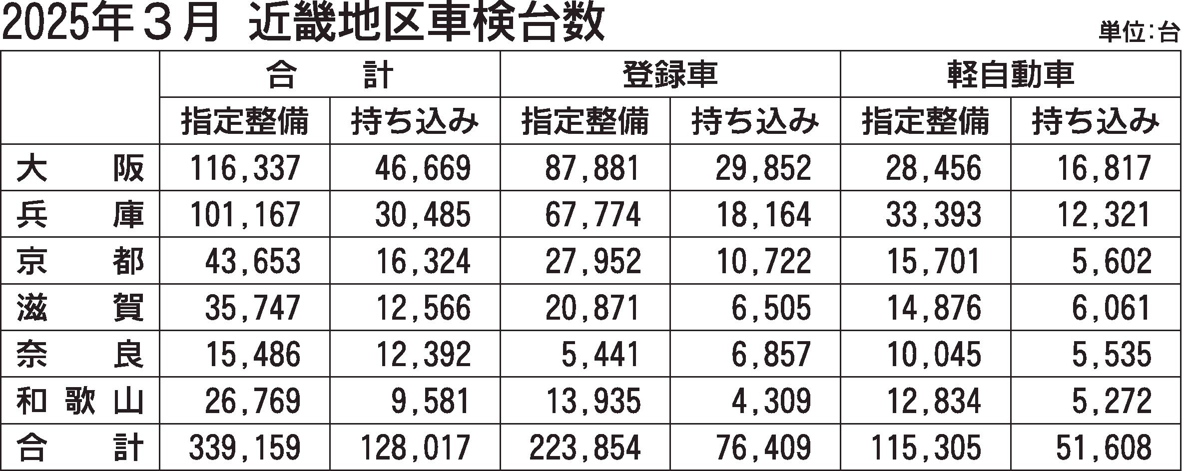 近畿2府4県の3月の継続検査(車検)台数(軽自動車を含む)は、前年同月比6.2%増の46万7176台で、2カ月ぶりに前年を上回った。登録車は同7.6%増の30万263台、軽は同3.8%増の16万6913台で、ともに2カ月ぶりのプラスとなっ...