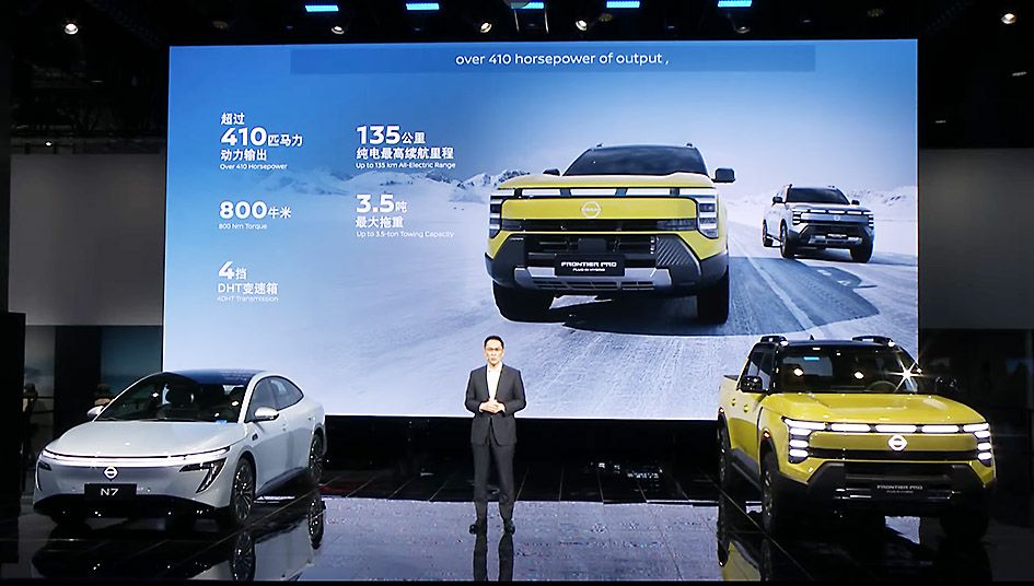日産自動車は4月23日、上海モーターショーの記者会見で、中国市場に投入する新エネルギー車(NEV)を2027年までに計10車種へと増やす方針を明らかにした。中国事業には26年末までに100億元(約2000億円)を追加投資する。今年発売予定の日産初となるピックアップトラックのプラグインハイブリッド車(PHV)「フロンティアプロ」も公開した。今月発売する電気自動車(EV)「N7」を皮切りに、中国のNEV市場での巻き返しを図る。