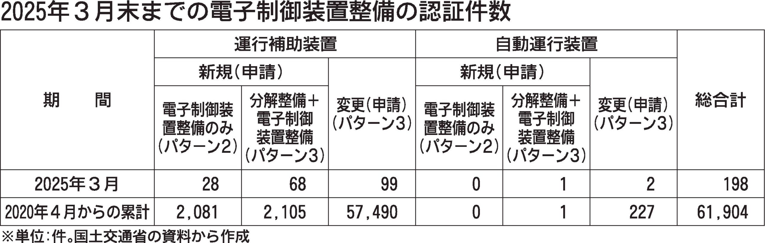 国土交通省がまとめた2025年3月の電子制御装置整備の認証件数は198件だった。特定整備制度が始まった20年4月からの累計件数は6万1904件(うち自動運行装置は227件)となった。 運行補助装置の新規申請は、電子制御装置整備のみを行う「...