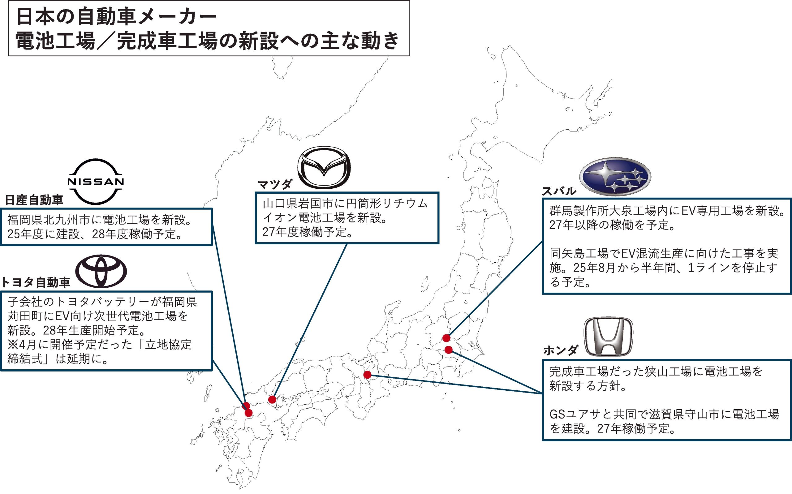 電動車シフトをにらんだ国内投資が本格化する。トヨタ自動車と日産自動車は完成車工場のある福岡県に、ホンダとマツダも生産拠点周辺に車載電池工場を新設する。スバルは、群馬製作所大泉工場(群馬県太田市)内に電気自動車(EV)専用ラインを設ける。い...