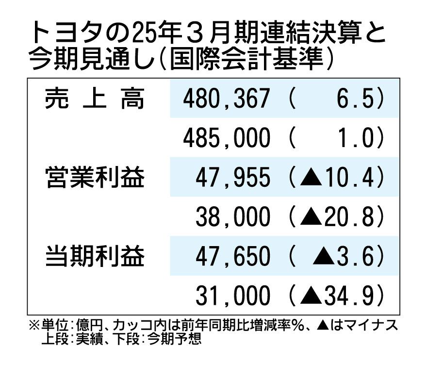 26年3月期の見通しは、営業収益が48兆5000億円(同1.0%増)、営業利益は3兆8000億円(同20.8%減)を見込む。5年連続の増収、2年連続の減益となる見通しだ。HVを中心に電動車の販売増を見込むが、円高や「トランプ関税」が減益要因となる。米国の関税影響は、4、5月分として1800億円織り込んだ。
