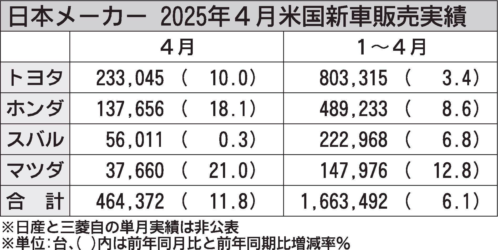 日本の自動車メーカー4社の4月の米国新車販売は前年同月比11.8%増の46万4372台で、2カ月連続で前年実績を上回った。燃費と実用性に優れたハイブリッド車(HV)の好調が続く。ただ、トランプ政権は4月3日から25%の追加関税を発動した。...