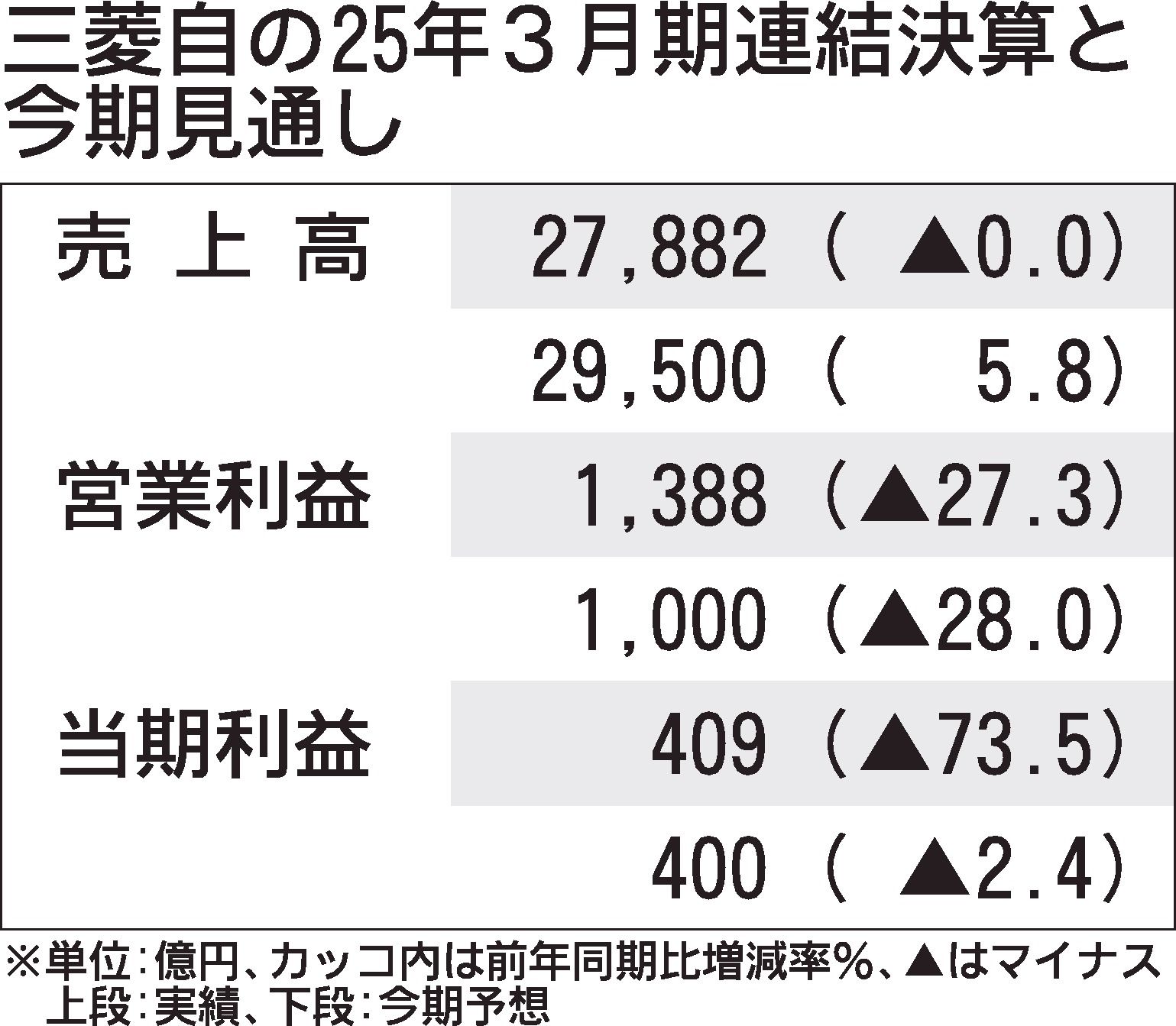 三菱自動車は8日、2026年3月期の業績予想を発表した。売上高は前期比5.8%増の2兆9500億円、営業利益は同28.0%減の1千億円を見込む。トランプ米政権による25%の追加関税で400億円の減益影響を見込むほか、北米での販売減、円高な...