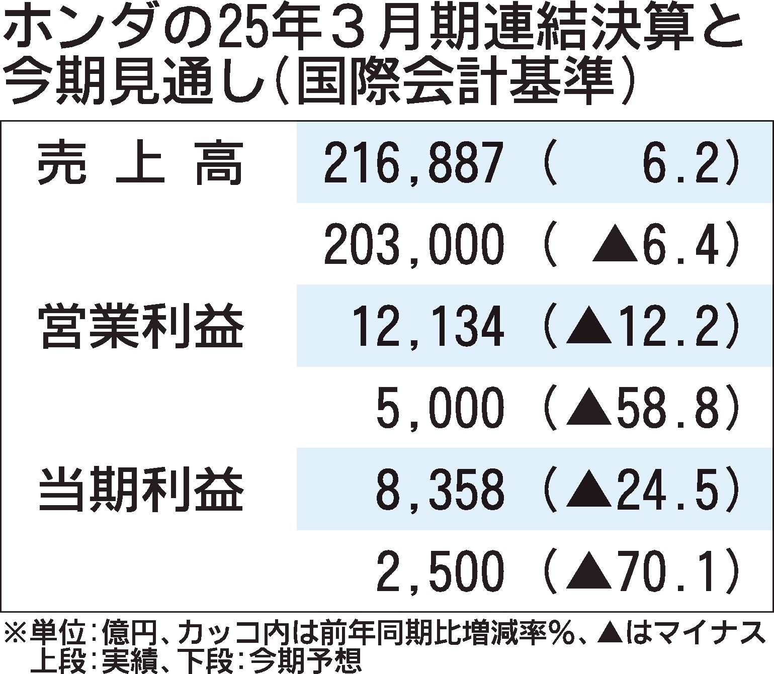 ホンダが13日に発表した2026年3月期業績見通しは、営業利益が前期比58.8%減の5千億円、当期純利益は同70.1%減の2500億円と大幅減益を予想する。トランプ米政権による追加関税は、四輪・二輪車などで6500億円の影響を受ける見通し...