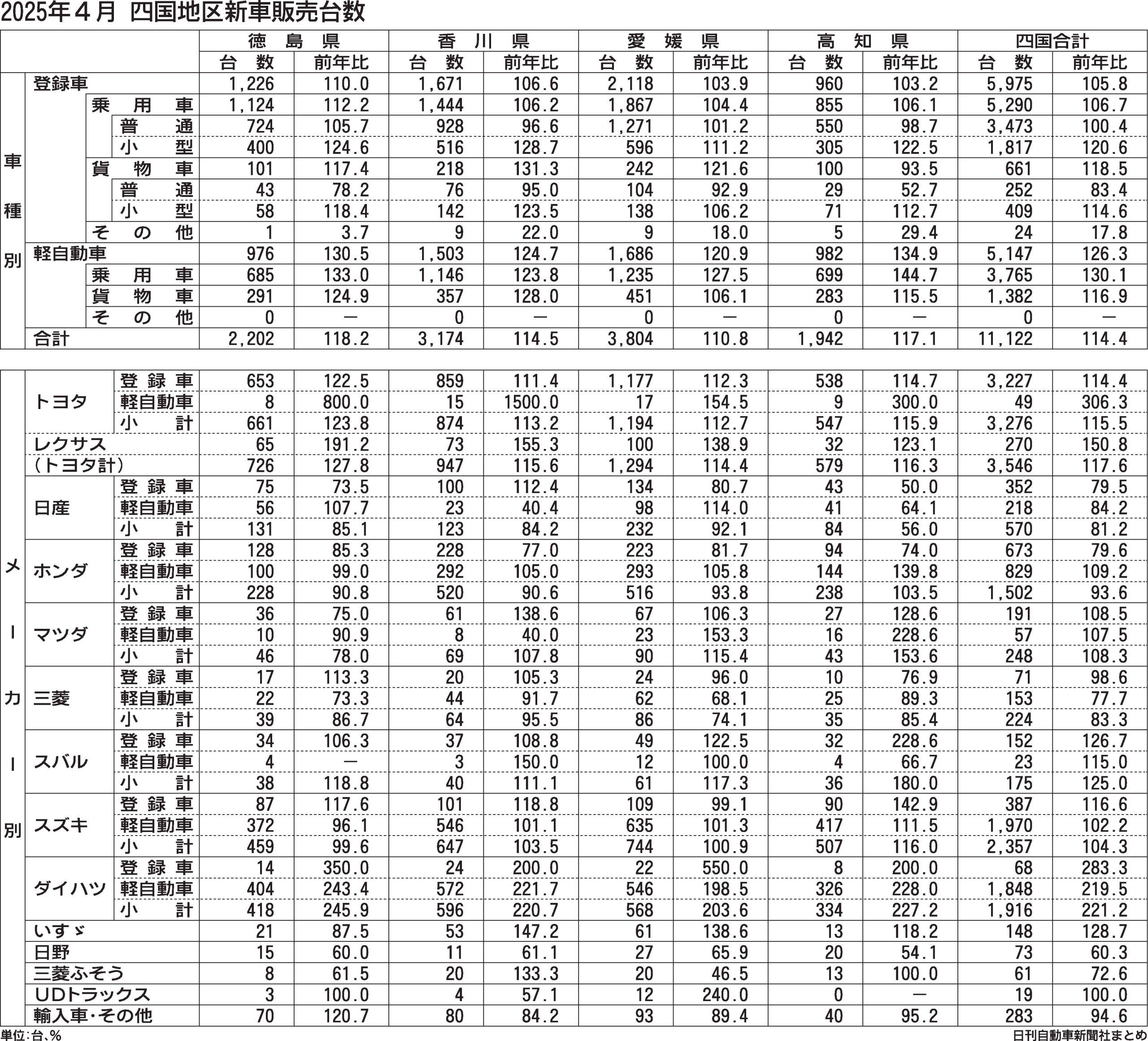 四国地区の4月の新車販売台数(登録車+軽自動車)は前年同月比14.4%増の1万1122台と4カ月連続で前年を上回った。トヨタで法規対応の継続生産車の登録・届出が順調に進んだほか、ダイハツで新車の出荷停止により大幅減少した前年の反動増が表れ...