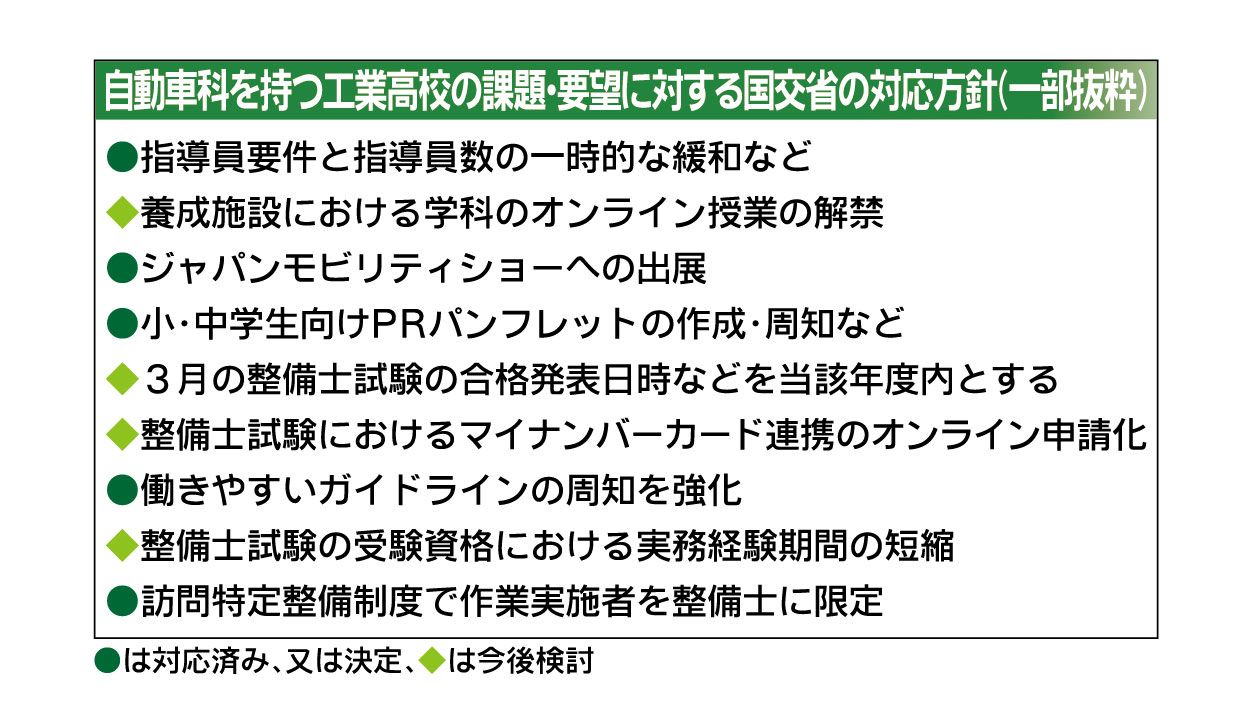 自動車科を持つ工業高校の課題解決に向け、産学官の連携強化による取り組みが本格的に動き始めている。国土交通省は工業高校に対するヒアリングを踏まえ、教員(指導員)要件の緩和など整備士の養成施設に関する制度改正を実施。教材や整備士の資格試験に関...