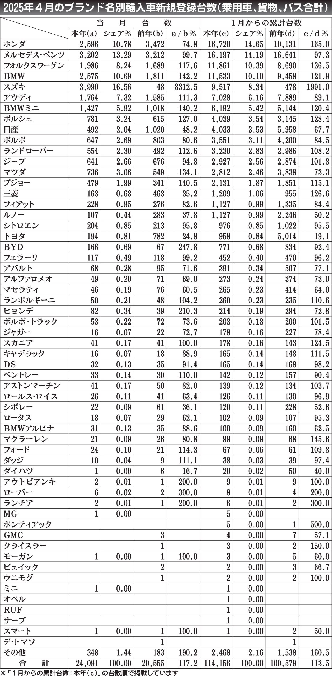 〈2025年4月のブランド名別輸入車新規登録台数(乗用車、貨物、バス合計)〉