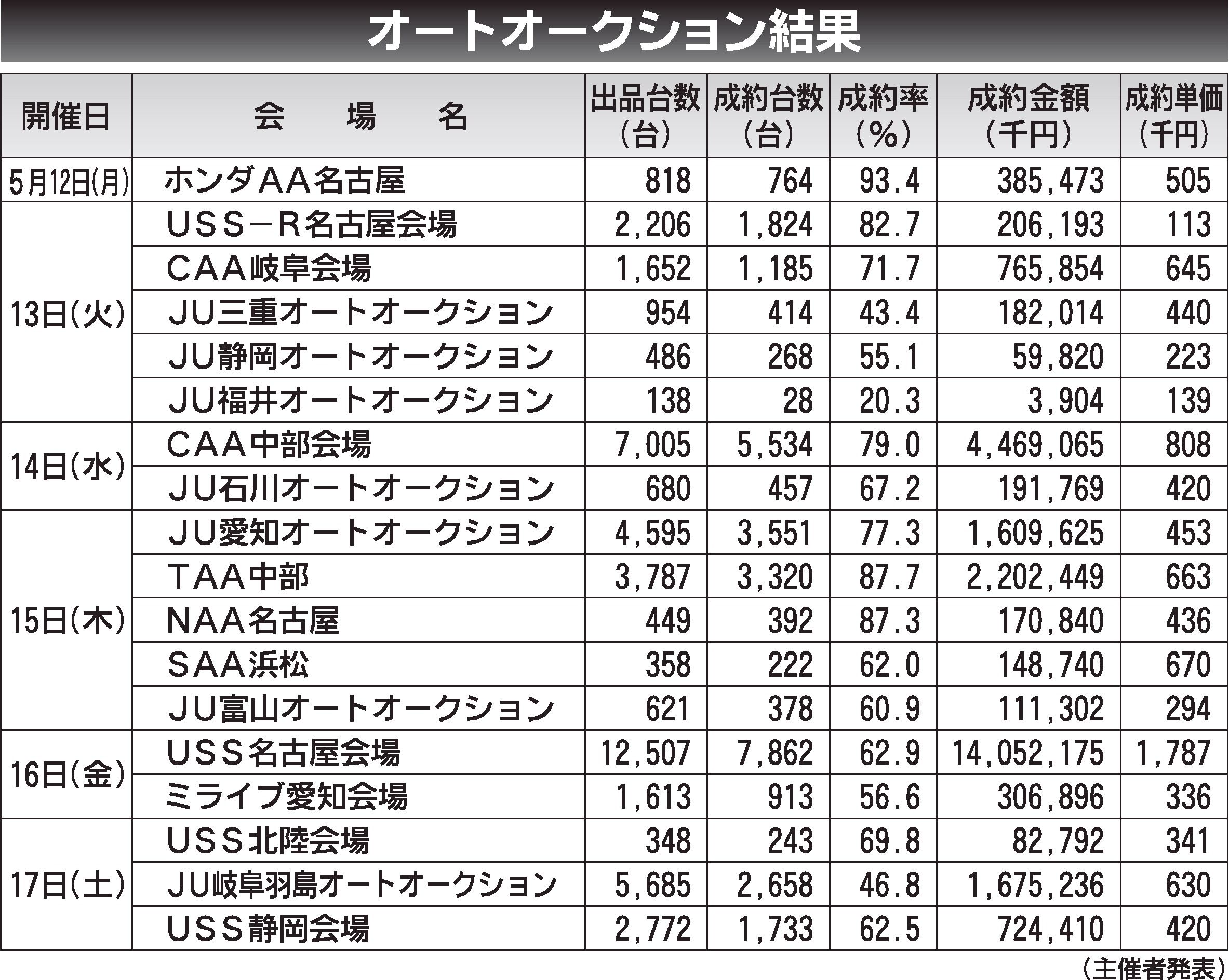 〈オートオークション結果〉中部地区 2025/5/12~17