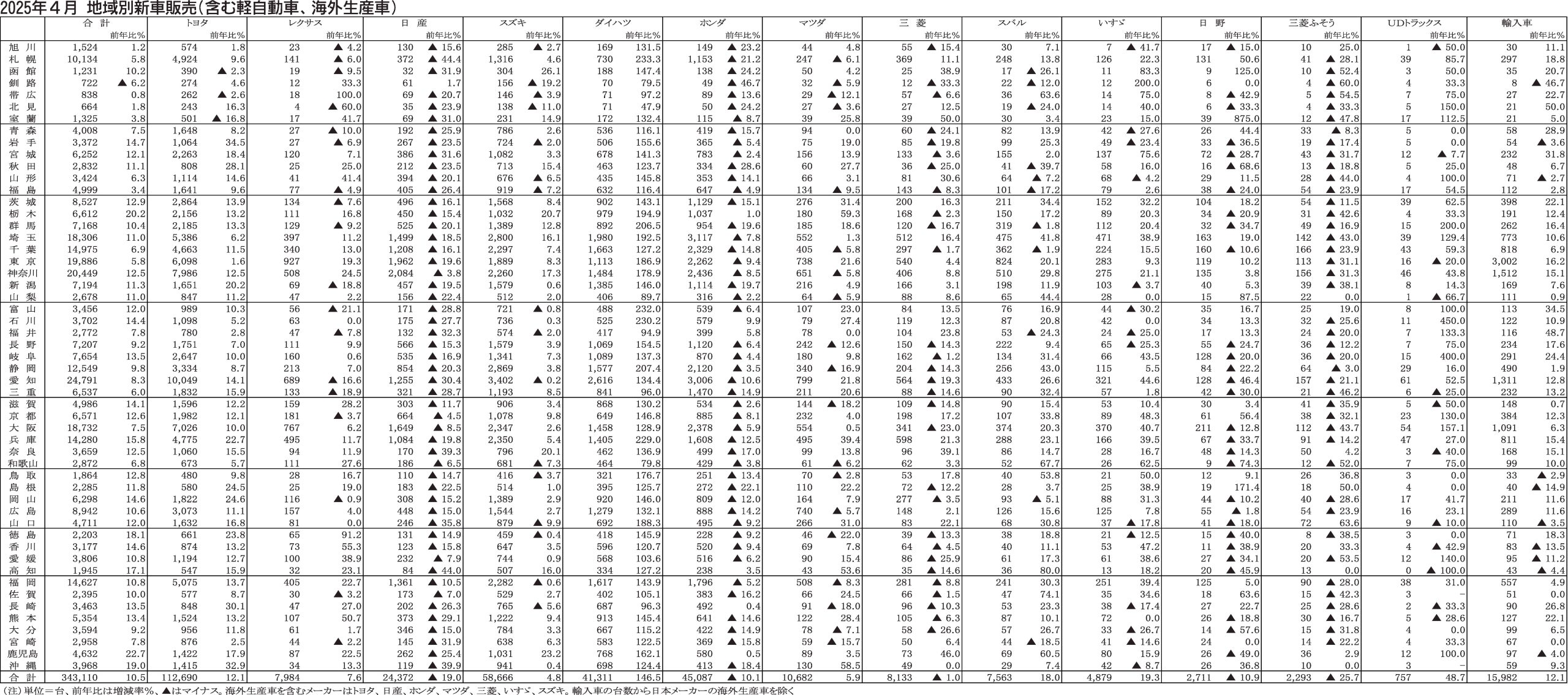 〈2025年4月地域別新車販売(含む軽自動車、海外生産車)〉