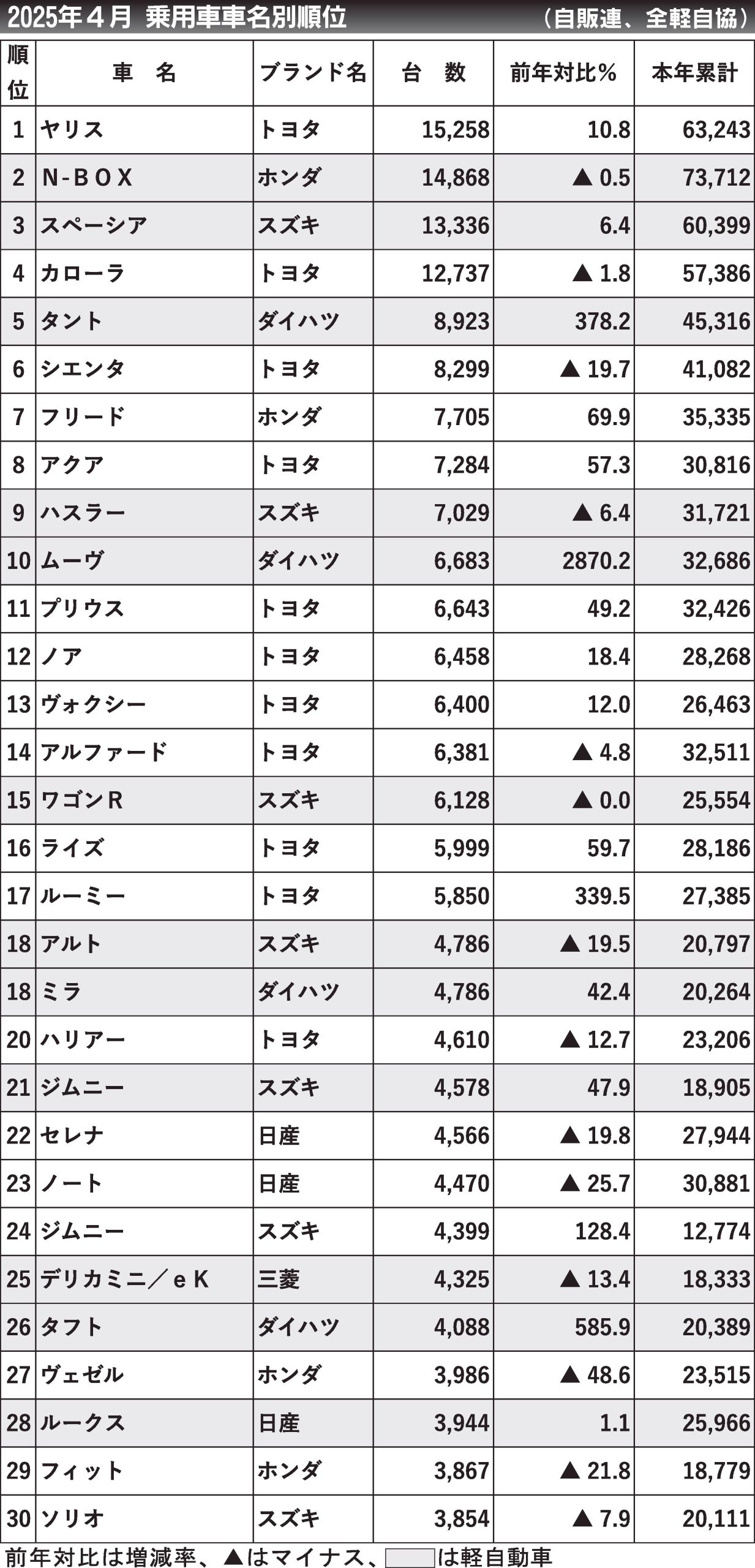 〈2025年4月乗用車車名別順位〉