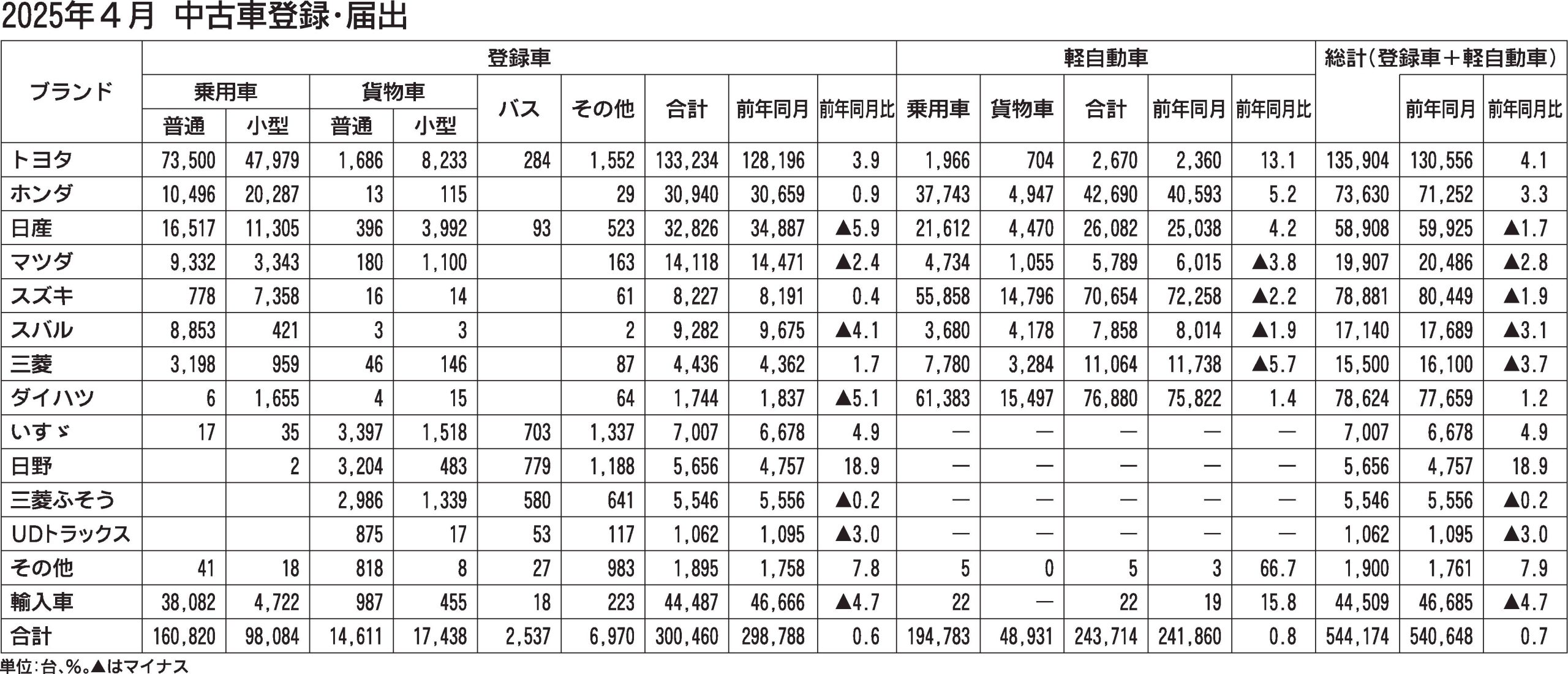 2025年4月の中古車登録・届け出台数、前年比0.7%増の54万4174台で3カ月ぶりプラス