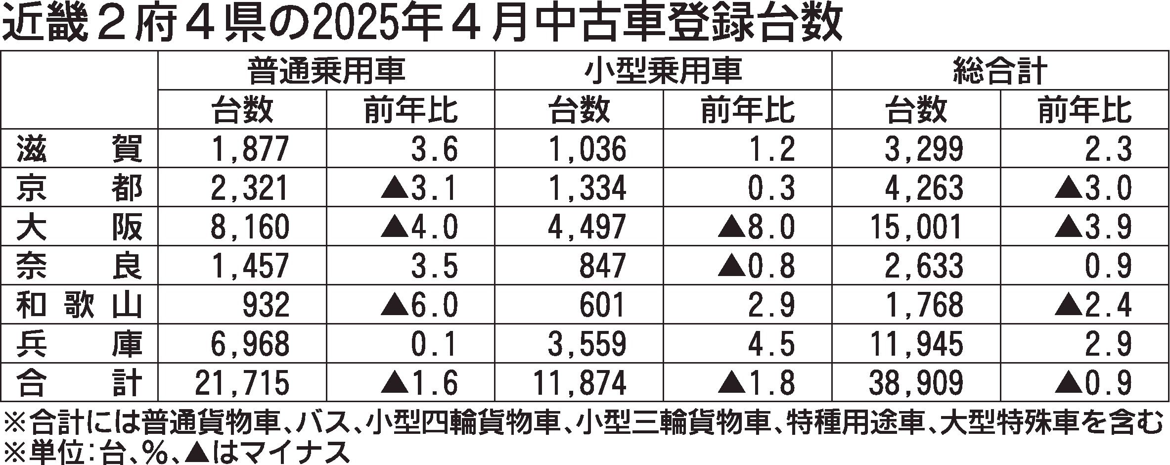 近畿2府4県の4月の中古車登録実績(軽自動車を除く)がまとまった。新規・移転・変更手続きを合算した登録台数は前年同月比0.9%減の3万8909台だった。3カ月連続で前年を下回った。 乗用車のうち、普通車は同1.6%減の2万1715台、小型...
